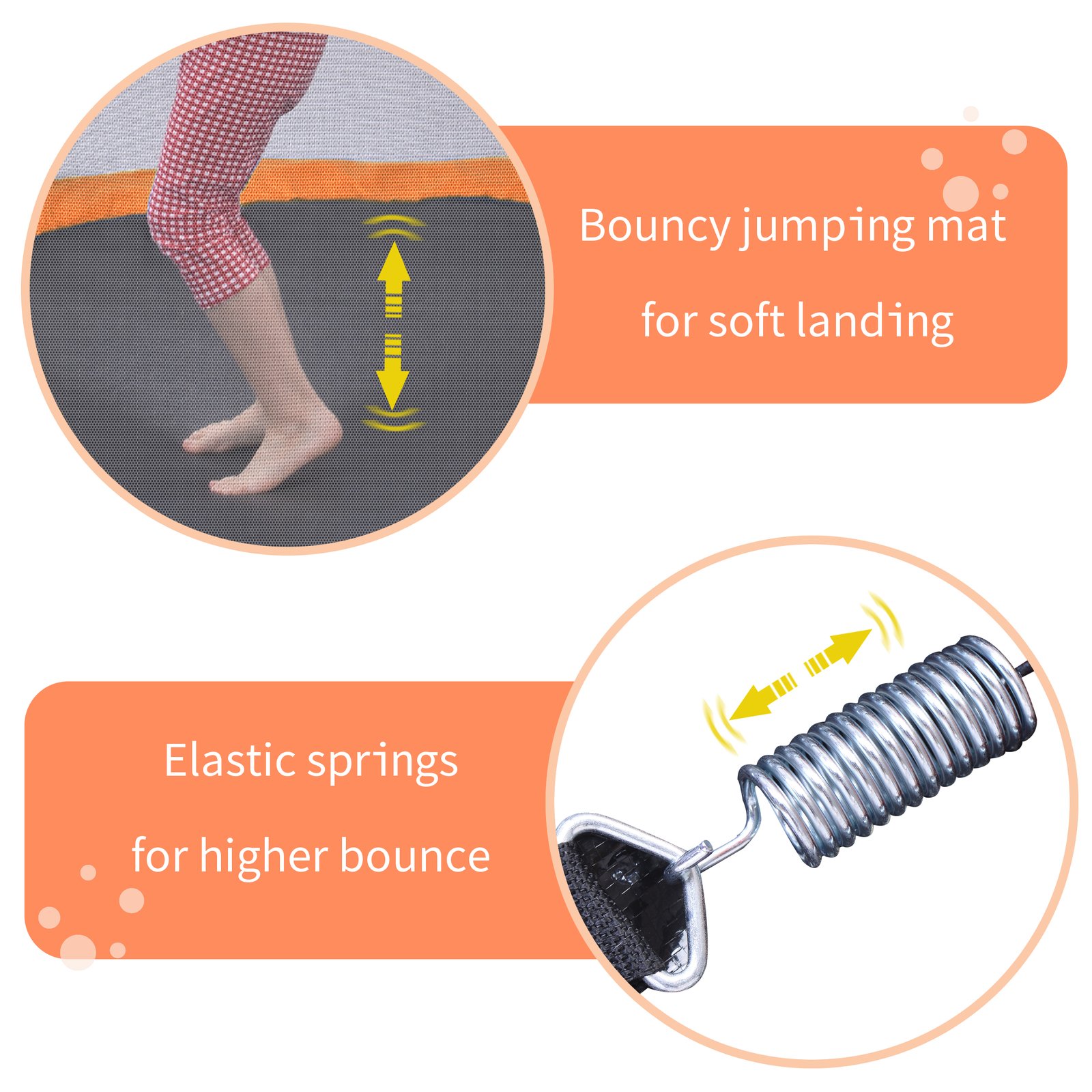 - SUPERIOR BOUNCE – Quality polypropylene jumping mat and heavy gauged 30 springs provide robust strength and bounce while jumping. The bright pink / green / blue color design makes the trampoline look more athletic and dynamic.