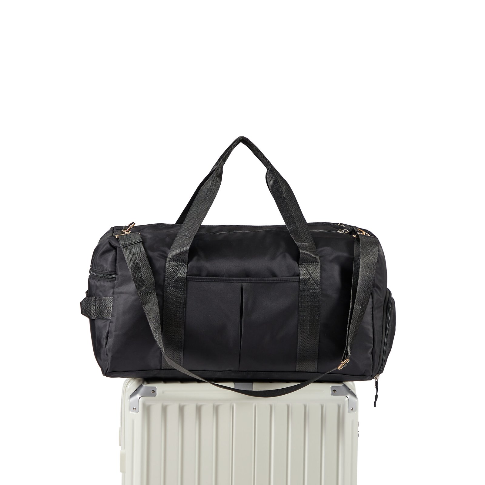 - The travel bag can be worn cross-body or handheld and has multiple compartments, a wet/dry compartment and a shoe compartment, so items have their own place and you don’t have to worry about shoes or wet towels dirtying your clean clothes.
