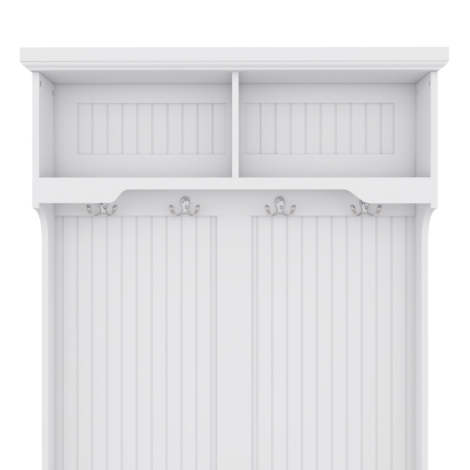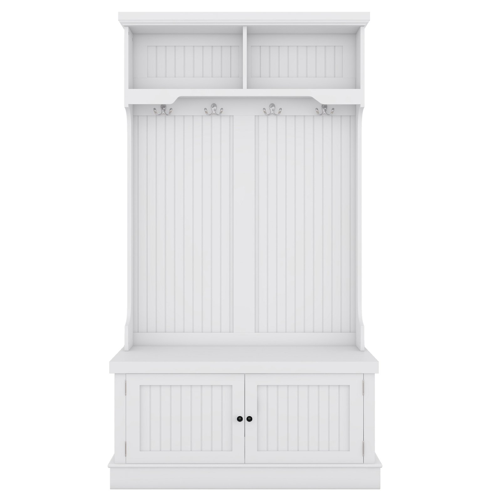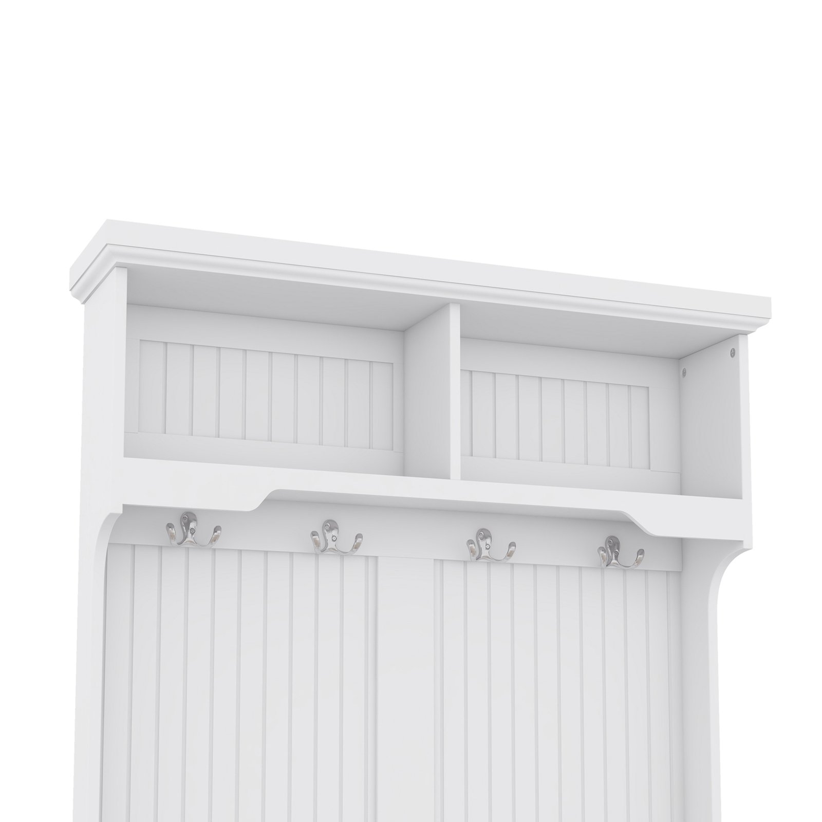 - 4-in-1 Design- This multifunctional hall tree is an Integrated coat rack with hooks, a shoe bench, a storage cabinet, and a display shelf, designed to fit for your entryway, laundry room, closet, bedroom, or mudroom use.