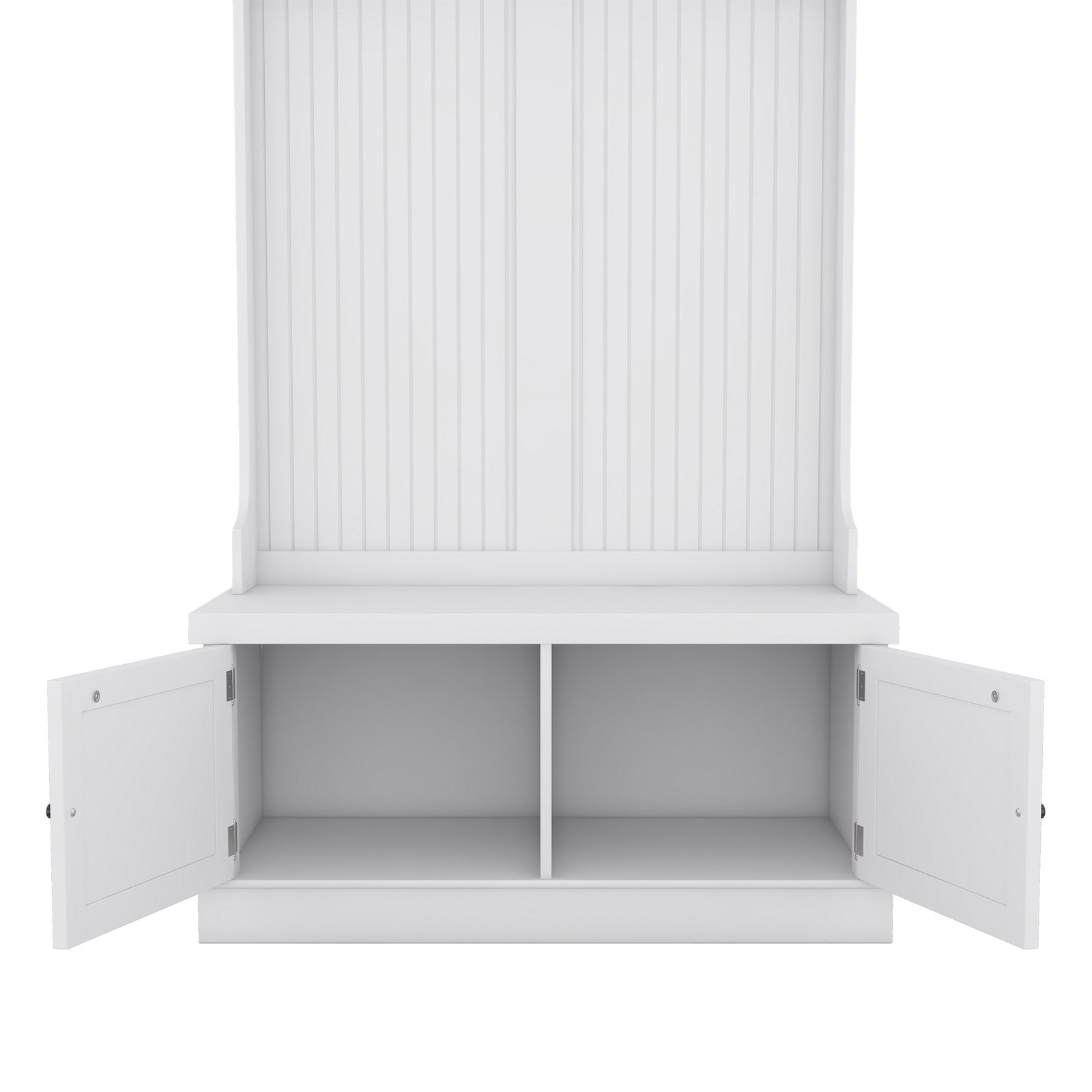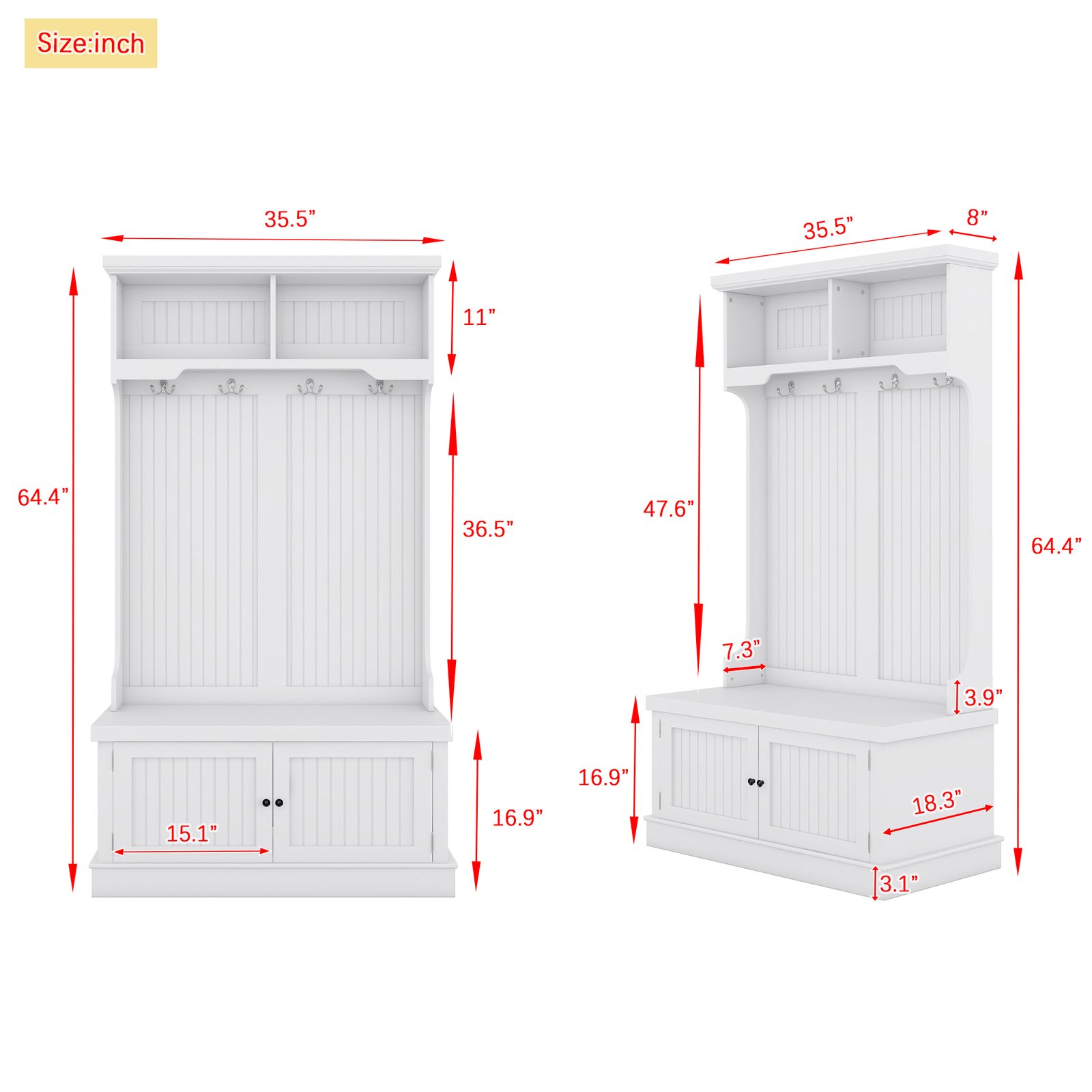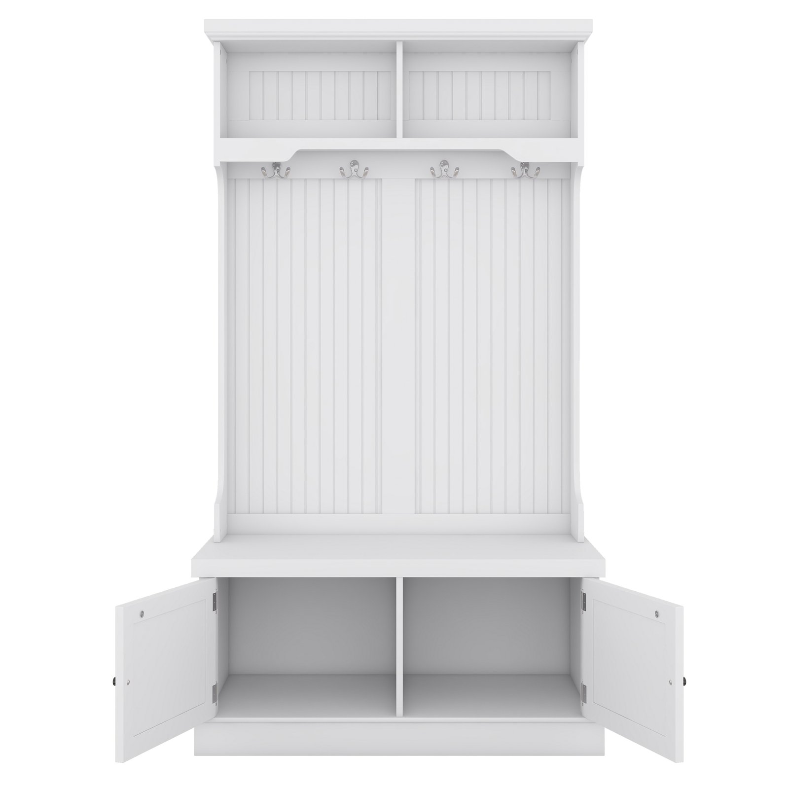 - 4-in-1 Design- This multifunctional hall tree is an Integrated coat rack with hooks, a shoe bench, a storage cabinet, and a display shelf, designed to fit for your entryway, laundry room, closet, bedroom, or mudroom use.