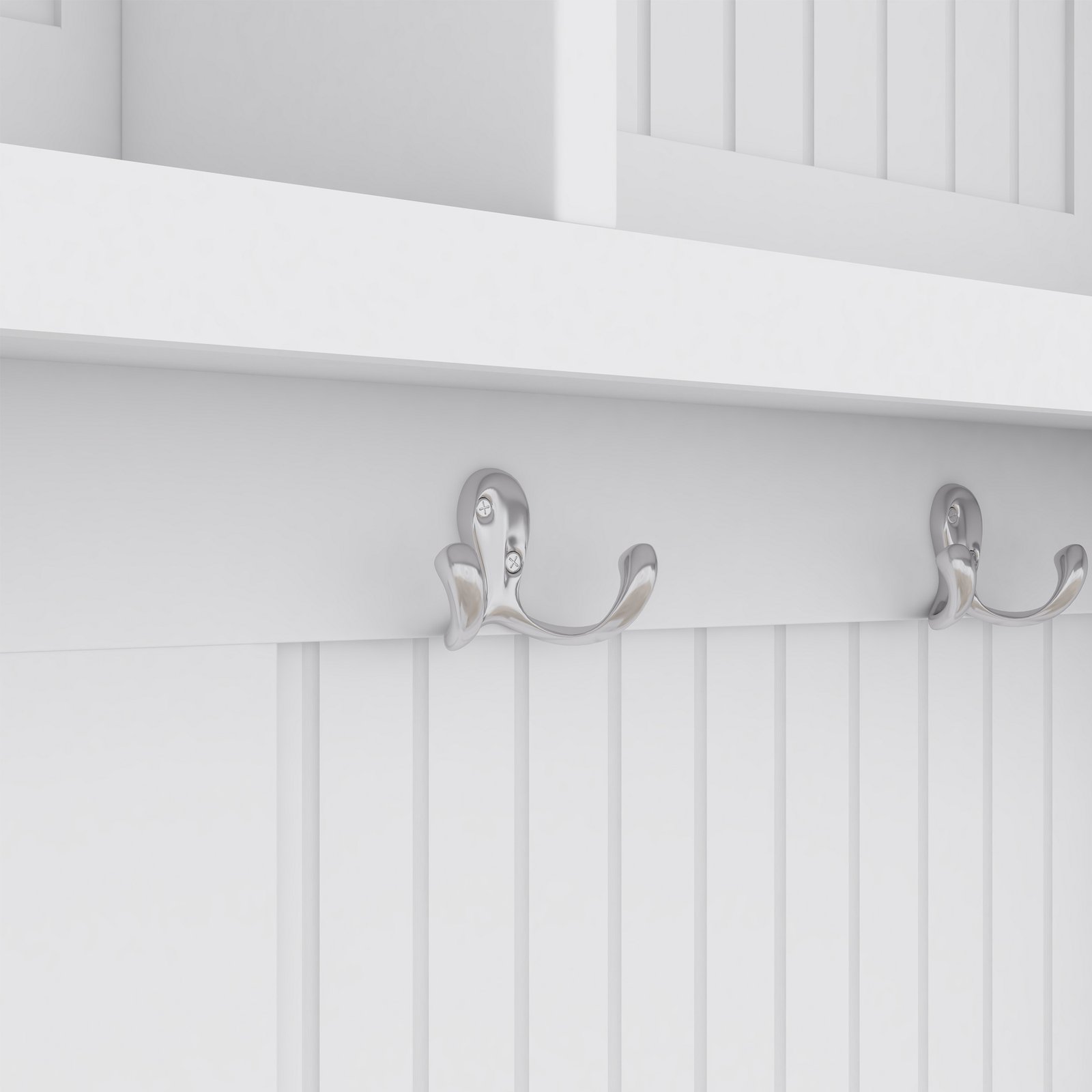 - Ample Storage Space- Metal Double hooks are designed to hang your coat, hat, scarves, keys, bags, and so on. Two upper display shelves keep clutter at bay and lower storage cabinets can help store your shoes.