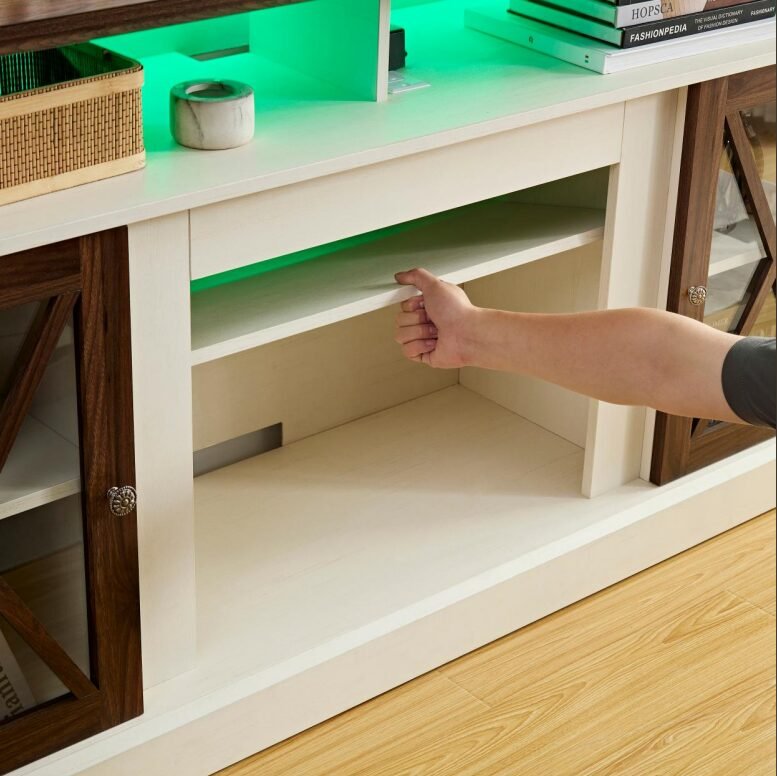 - RGB LED System TV Stand w/ Outlets: The LED TV cabinet in the entertainment center is equipped with 16 colors and 4 color flashing modes with wireless remote control. Also, you can DIY more colors as you like by APP to create great entertainment atmosphere when you are watching movies or using devices for gaming, you can freely choose your favorite color and dynamic mode to increase your entertainment experience; during Christmas, Halloween and other major holidays