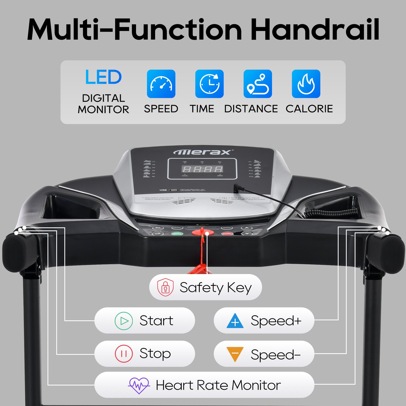 MULTI-FUNCTION HANDRAIL: The multi-functional handlebar effectively assists the user during exercise, supporting quick speed adjustments and one-touch start and stop. Monitor your target heart rate in real time with the built-in handrail heart sensor, tracking your pulse rate during exercise ensures that you are exercising correctly and efficiently.QUIET BRUSHLESS MOTOR: Our brushless motor with max 2.5 HP provides efficient, reliable, and low-maintenance operation, while providing speeds of 7.5 MPH and emitting only 40-65 dB of noise, ensuring your workouts won”t disturb your downstairs or next-doors.INCLINE TREADMILL: Customize the intensity of your workout with 3 different manual incline positions. Simulate the challenge of running uphill and feel the burn in your leg muscles as you push yourself to new heights.EASY FOLDING & STORAGE : The two convenient detachable knobs at the bottom side provide easy folding and storage capabilities. Simply loosen the knobs for approx 15 seconds to complete the folding process. The bottom wheels facilitate movement and storage.SMART DISPLAY WITH SPEAKER: Multi-functional LED Display to track your performance in time, speed, distance and calories burnt, promising a superior and effective home treadmill workout. Simply plug in your phone or insert USB flash drive, and you can emerge into training with your workout playlist. Phone/Pad deck available.